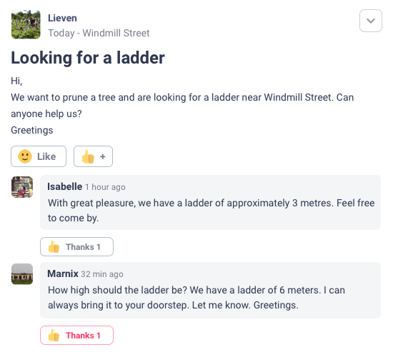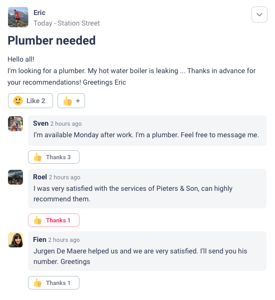 Seit vielen Jahren wurden immer wieder Initiativen ergriffen, um Menschen mit Flyern, Plakaten, kostenlosen Snacks und Getränken zusammenzubringen ... Aber meist mit dürftigem Ergebnis. Die Tatsache, dass Hoplr nun erfolgreich zu sein scheint, zeigt, dass dieses Nachbarschaftsnetzwerk eine große Zukunft hat.Erik, Moderator Heiende (Lokeren)