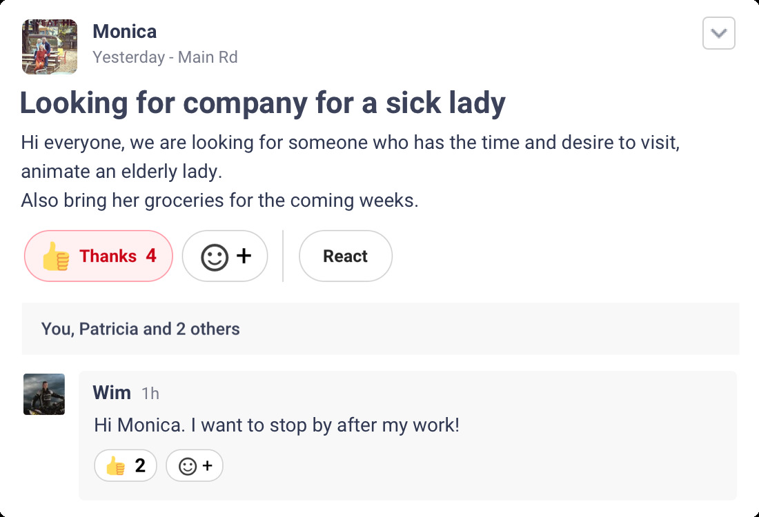 - Helfen Sie Nachbarn durch private Unterhaltungen oder starten Sie einfach eine Chat-Gruppe für informelle Betreuung.